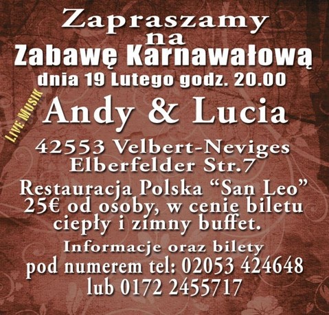 Zapraszamy serdecznie na zabawę karnawałową dnia 19 lutego o godzinie 20, Andy & Lucia